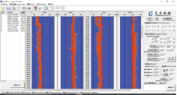 在分析軟件主界面上可以進行實測數(shù)據(jù)瀏覽、孔壁位置自動判讀/人工判讀、結(jié)果參數(shù)分析計算、測試報告自動生成等功能。