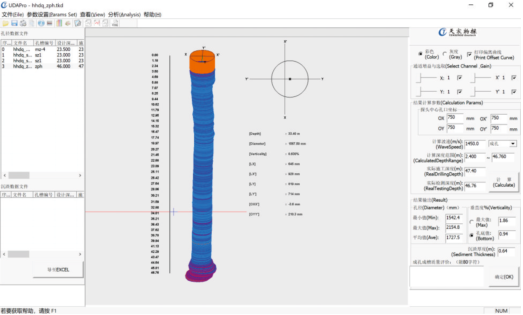 在結(jié)果數(shù)表瀏覽界面可以查看所有深度測點的實測結(jié)果(四壁間距、偏移值、孔徑和垂直度),孔徑和垂直度異常值突出顯示,亦可直接在此處修改誤判值。可將此數(shù)表導(dǎo)出到Excel數(shù)表中。
