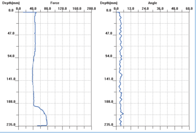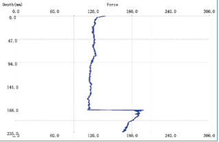 ①當探針伸出188mm時,探針壓力值突然增大,傾角也開始變大,依此判定沉渣厚度188.0mm。