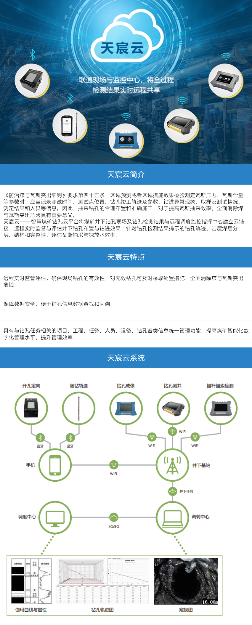 ? ? ? 天宸云——智慧煤礦鉆孔云平臺將煤礦井下鉆孔現(xiàn)場及鉆孔檢測結(jié)果與遠(yuǎn)程調(diào)度監(jiān)控指揮中心建立云鏈接,遠(yuǎn)程實時監(jiān)督與評估井下鉆孔布置與鉆進(jìn)效果,針對鉆孔檢測結(jié)果揭示的鉆孔軌跡、巖層煤層分層、結(jié)構(gòu)和完整性,評估瓦斯抽采與探放水效率。