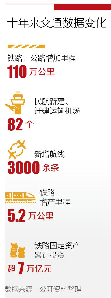 黨的十八大以來,我國(guó)加快建設(shè)“八縱八橫”高速鐵路主通道、“71118”國(guó)家高速公路主線、世界級(jí)港口群、世界級(jí)機(jī)場(chǎng)群,綜合交通網(wǎng)突破600萬公里,“2012年到2021年底,鐵路、公路增加里程約110萬公里,高速鐵路、高速公路對(duì)20萬以上人口城市的覆蓋率均超過95%”。