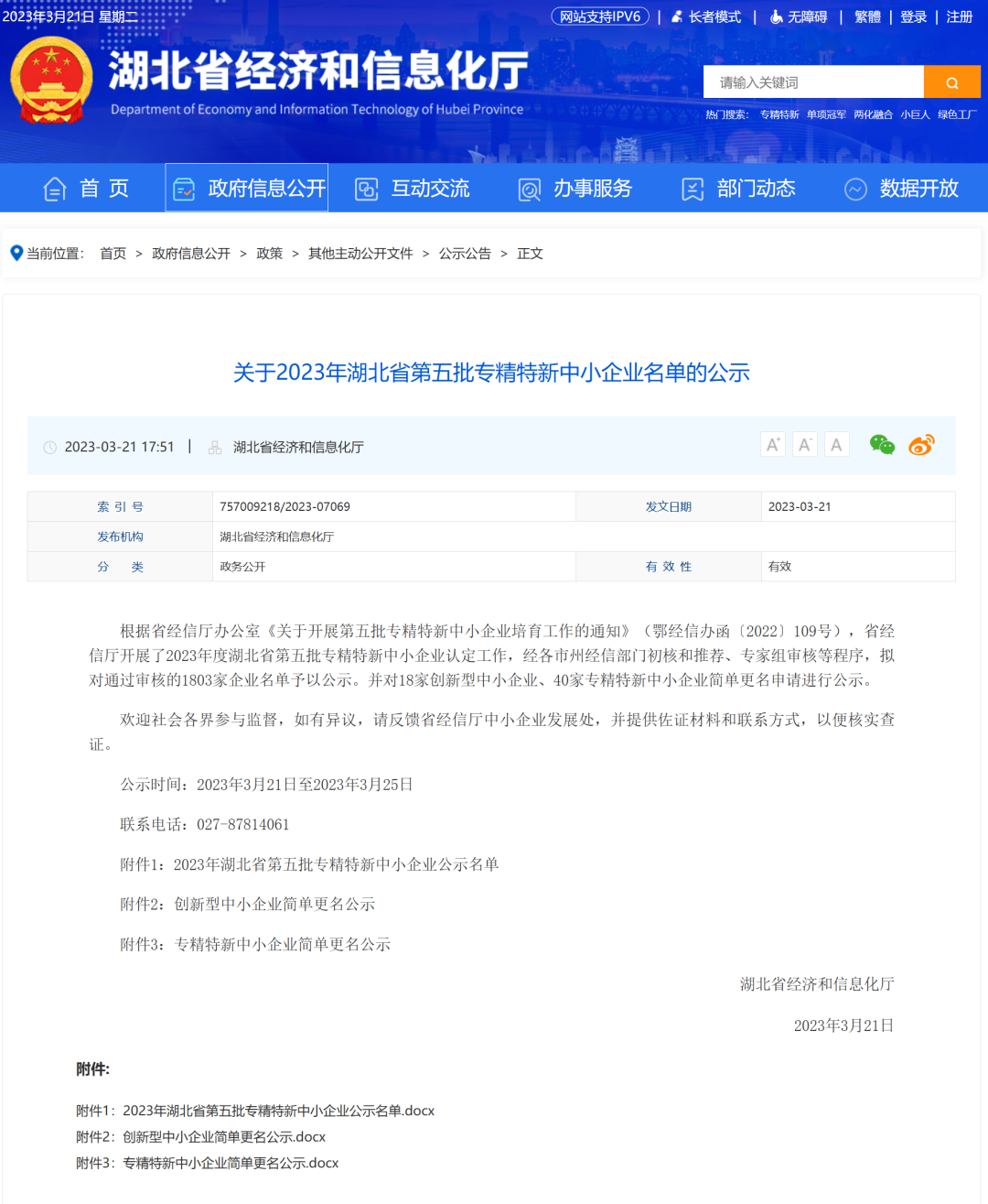 根據(jù)省經(jīng)信廳辦公室《關(guān)于開展第五批專精特新中小企業(yè)培育工作的通知》(鄂經(jīng)信辦函〔2022〕109號),省經(jīng)信廳開展了2023年度湖北省第五批專精特新中小企業(yè)認(rèn)定工作,經(jīng)各市州經(jīng)信部門初核和推薦、專家組審核等程序,擬對通過審核的1803家企業(yè)名單予以公示。并對18家創(chuàng)新型中小企業(yè)、40家專精特新中小企業(yè)簡單更名申請進(jìn)行公示。