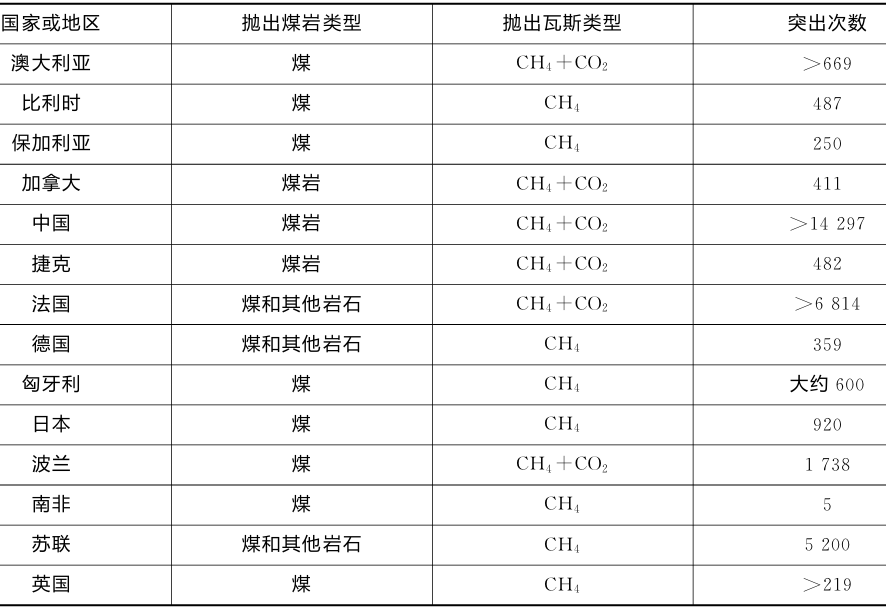煤與瓦斯突出是一個世界性的煤礦開采時發(fā)生的動力現(xiàn)象,幾乎所有的產(chǎn)煤國家都發(fā)生過煤與瓦斯突出。目前,世界上共發(fā)生30000多次煤與瓦斯突出。世界主要的采煤國家發(fā)生的煤與瓦斯突出情況如表1所示。