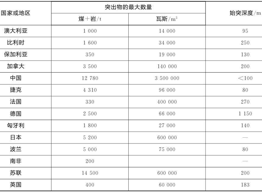 突出時的拋出物除了煤以外,還可能是巖石,巖石大多數(shù)為砂巖,也有少數(shù)為砂質(zhì)頁巖、玢巖等。并且突出的煤種從低變質(zhì)的褐煤到高變質(zhì)的無煙煤都有。煤與瓦斯突出通常在一定的深度才發(fā)生。世界范圍內(nèi),發(fā)生煤與瓦斯突出的始突深度差別很大。表2為世界主要采煤國家的始突深度統(tǒng)計結果。我國是世界上突出災害最為嚴重的國家,近一半的突出發(fā)生在我國,因此瓦斯災害防治工作對我國而言至關重要。