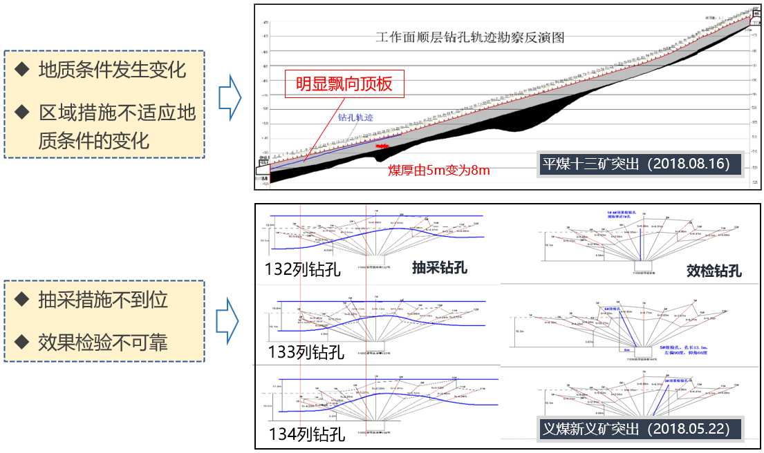 煤與瓦斯突出防治措施不到位、突出防治措施不能適應地質(zhì)條件的變化和區(qū)域措施效果檢驗不能真實反映煤層的突出危險,以至于產(chǎn)生了區(qū)域達標的假象,如圖2所示。