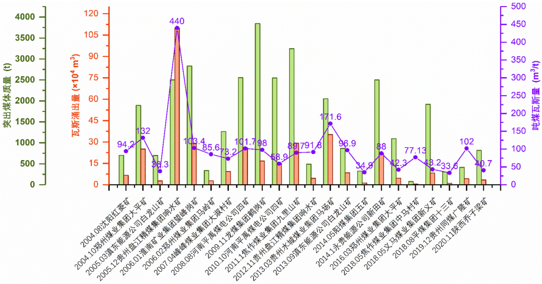 煤與瓦斯突出是煤層中存儲的瓦斯能和應力能的失穩(wěn)釋放,表現(xiàn)為在極短的時間內(nèi)向生產(chǎn)空間拋出大量的煤巖和瓦斯并可能誘發(fā)破壞性更大的瓦斯爆炸。突出可能發(fā)生在鉆孔掘進和煤炭開采過程中,突出可能在幾十秒內(nèi)發(fā)生,也可能有幾分鐘至幾小時的延遲。隨著開采深度的增加,地應力和瓦斯壓力不斷增加,煤與瓦斯突出災害日趨嚴重。