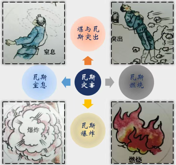 我國煤礦事故的統(tǒng)計分類,煤礦瓦斯事故分為煤與瓦斯突出、瓦斯爆炸、瓦斯燃燒和瓦斯窒息四類,其中前兩類發(fā)生最多,危害最大。